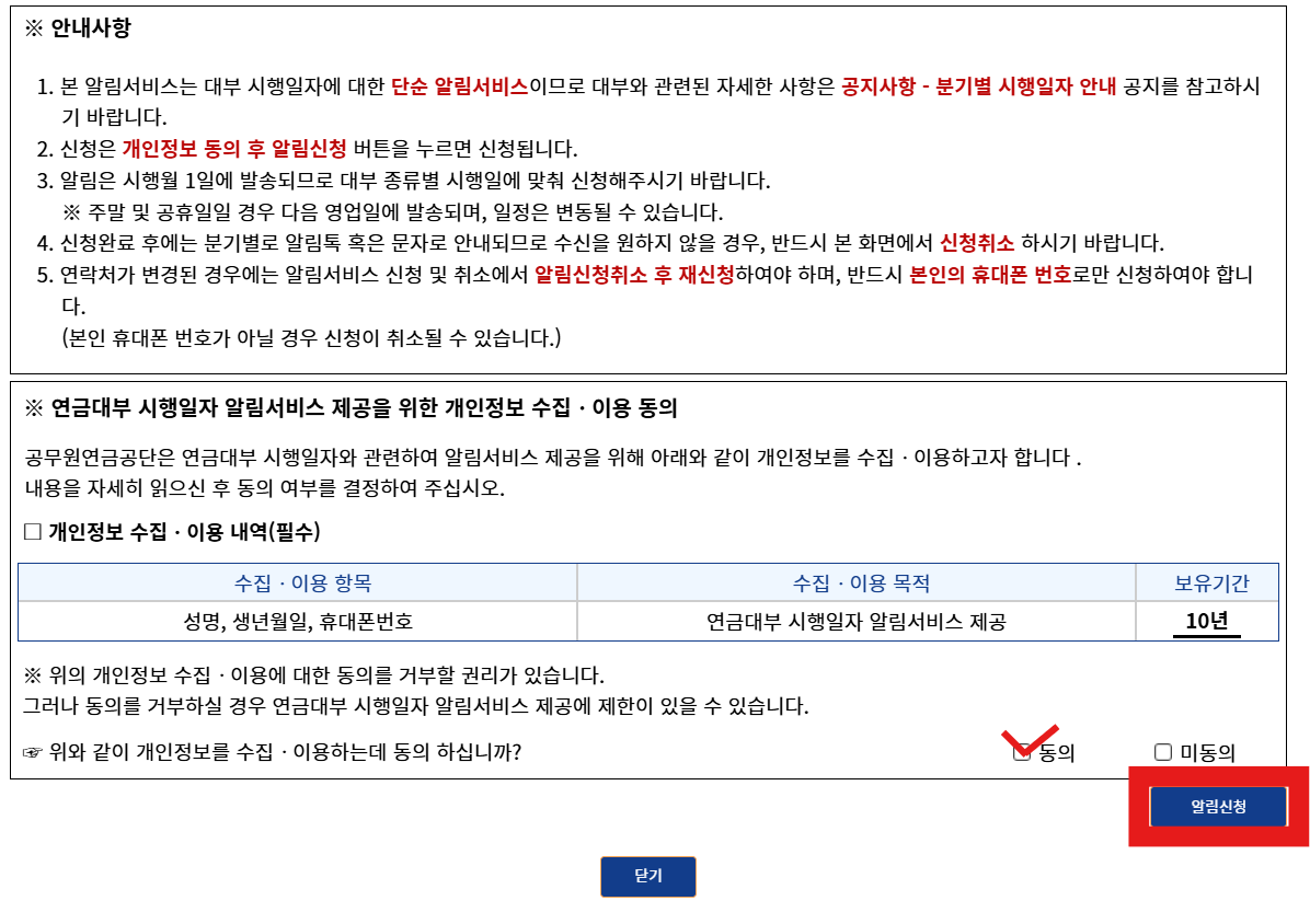 3. 안내사항을 읽고, '동의'를 클릭한 후 '알림신청'을 클릭하면 신청이 됩니다.