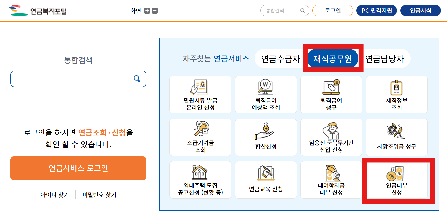 2. 재직공무원 탭을 클릭-연금대부신청을 들어갑니다